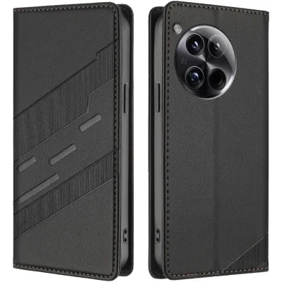 Phonesta Embossed Lines Book Wallet Case hoesje voor OnePlus 12 - Zwart